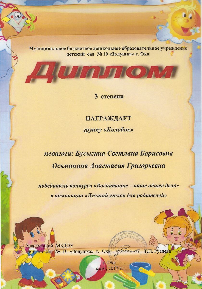Диплом 3 степени победителя конкурса "Воспитание-наше общее дело" в номинации "Лучший уголок для родителей"